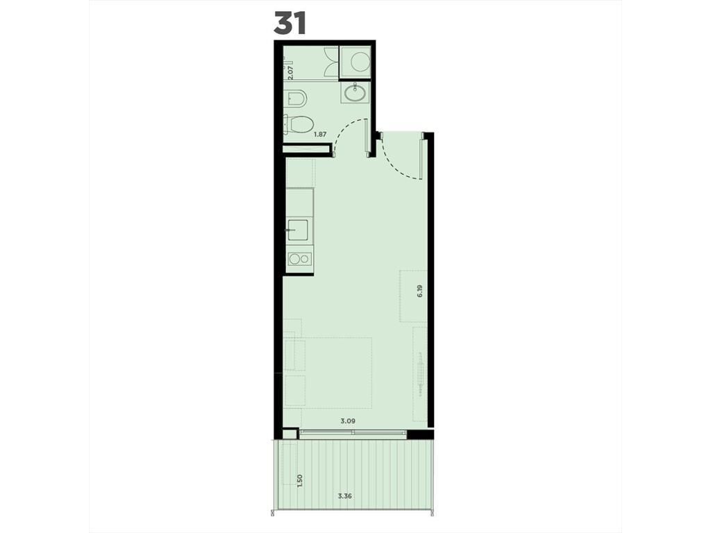 Monoambiente con terraza, cocina integrada con placares, 1 baño.