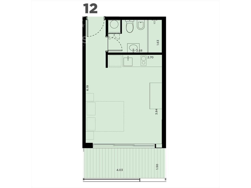 Monoambiente con terraza al jardín, cocina integrada con placares, 1 baño.