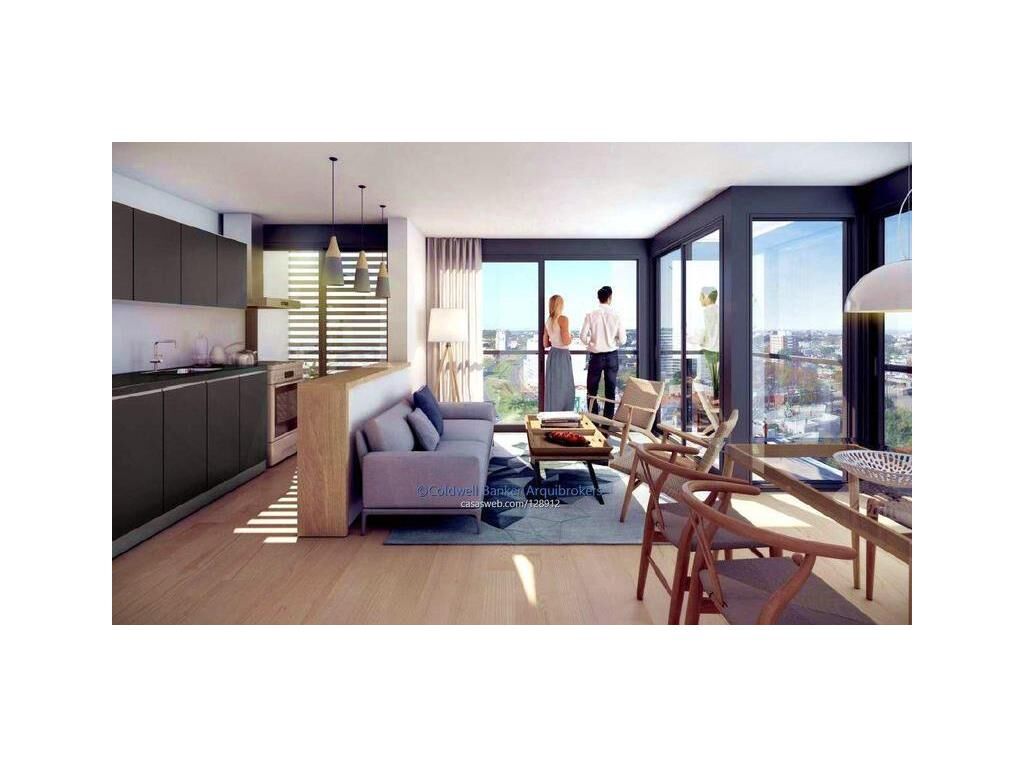 Monoambiente con cocina integrada con placares sobre y bajo mesada, terraza al frente, 1 baño.