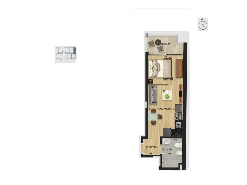 Monoambiente con terraza al frente, cocina integrada con placares, 1 baño completo.