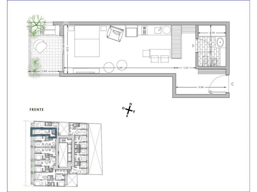 Monoambiente con terraza al frente, cocina integrada con placares, con bacha de acero inoxidable y mesadas de Silestone, horno anafe y campana de extracción. 1 baño completo.