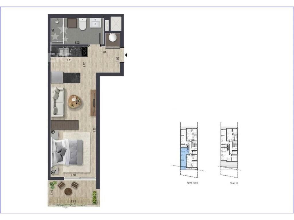 Monoambiente con terraza al frente, cocina integrada con placares, lugar para lavarropas, 1 baño.