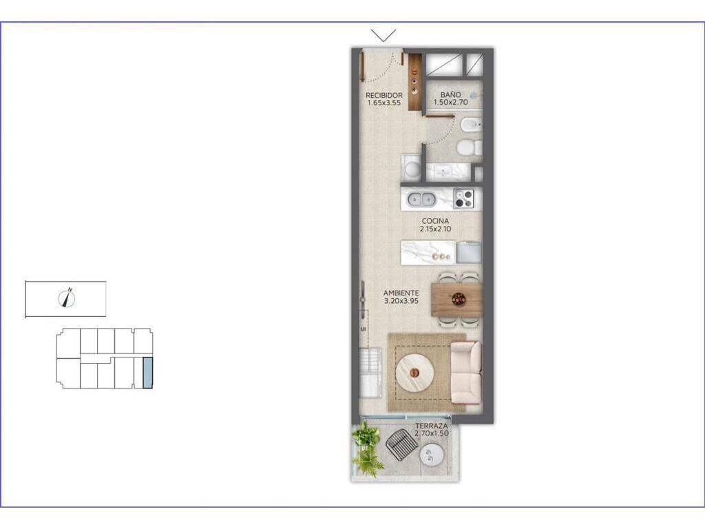 Monoambiente con terraza al frente, cocina integrada con placares y campana, horno y anafe, 1 baño completo.