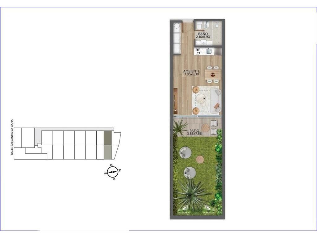 Monoambiente con cocina integrada con placares y extractor, 1 baño completo. Patio de 31 m2.
