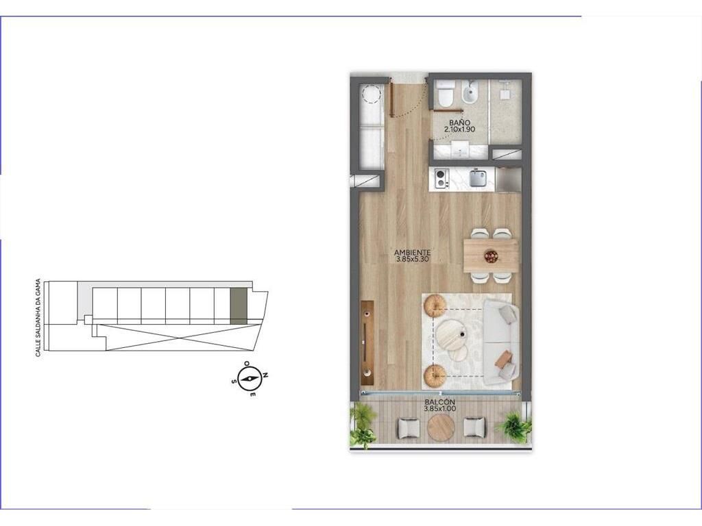 Monoambiente con terraza, cocina integrada con placares y extractor, 1 baño completo.