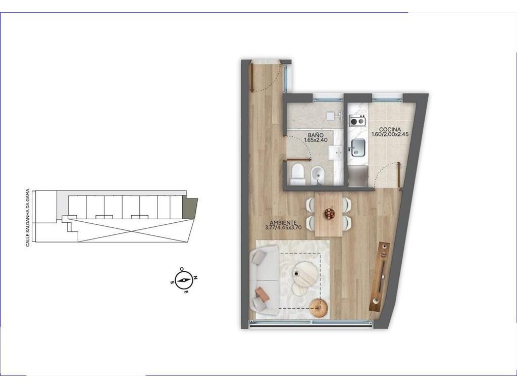 Monoambiente con cocina integrada con placares y extractor, 1 baño completo.