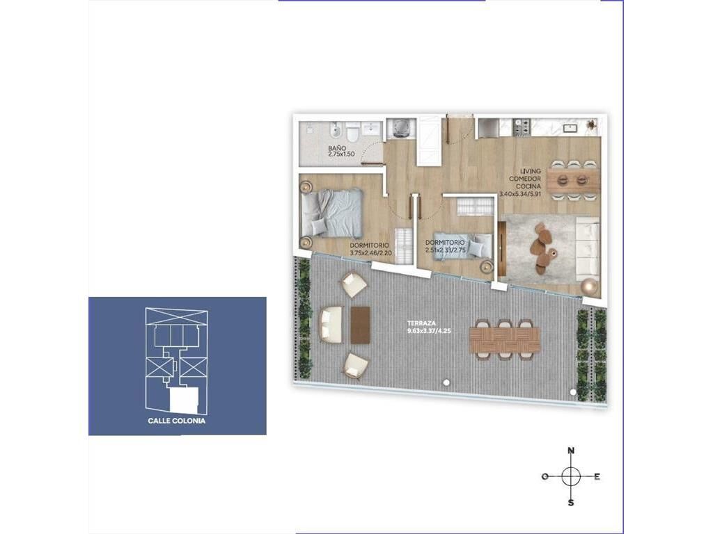 Living comedor con terraza al frente de 37 m2, cocina integrada con placares, 2 dormitorios con salida a terraza al frente, 1 baño.