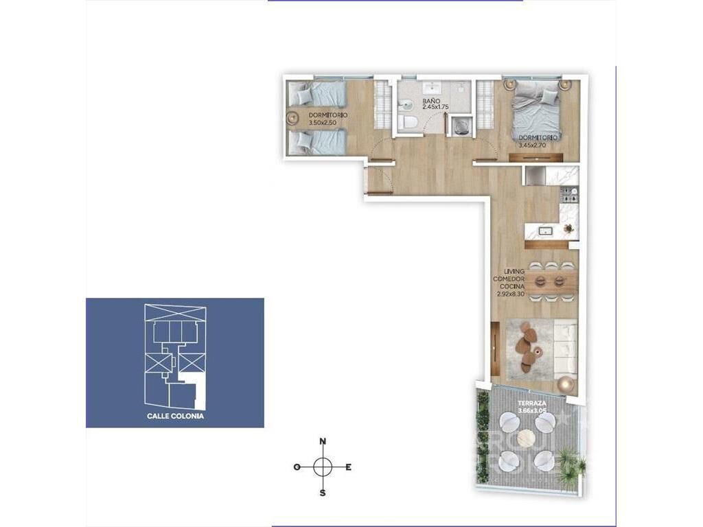 Living comedor con terraza al frente de 11 m2, cocina integrada con placares, 2 dormitorios, 1 baño.