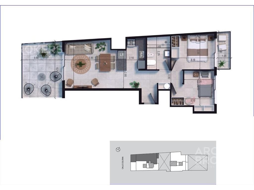 Living comedor con terraza al frente de 15m2, cocina integrada con placares y barra, 2 dormitorios con placares, el principal con terraza, lugar para lavarropas, 1 baño.