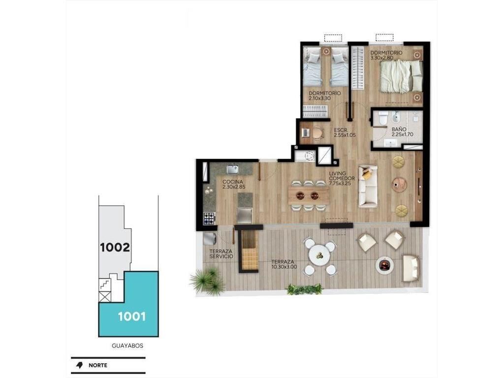 Living comedor con terraza al frente de 29 m2 con parrillero, cocina integrada con placares y campana, terraza lavadero, 2 dormitorios, 1 baño completo con extractor.