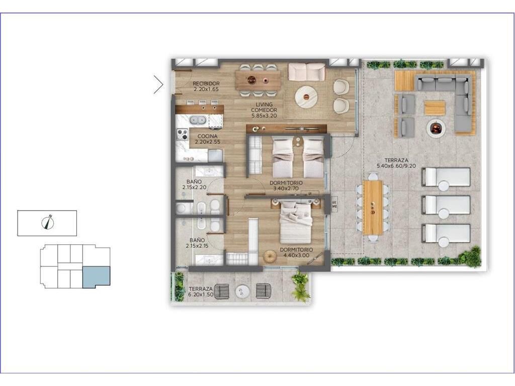 Living comedor con terraza de 77 m2, cocina integrada con placares y campana, horno y anafe, 2 dormitorios con placares y terraza, 1 en suite con vestidor y salida a terraza, 2 baños completos.