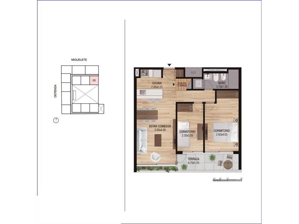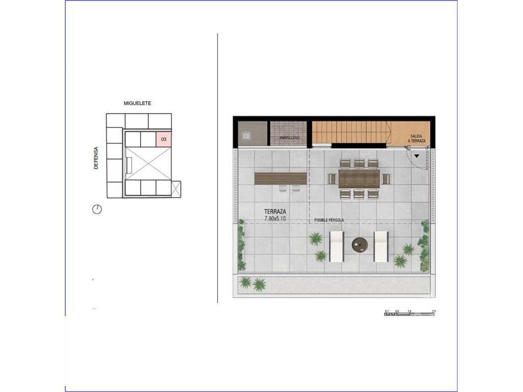 Living comedor con terraza, cocina integrada con placares, 2 dormitorios con placares y 1 baño completo, escalera interior hacia azotea propia de 41 m2 con parrillero y depósito.