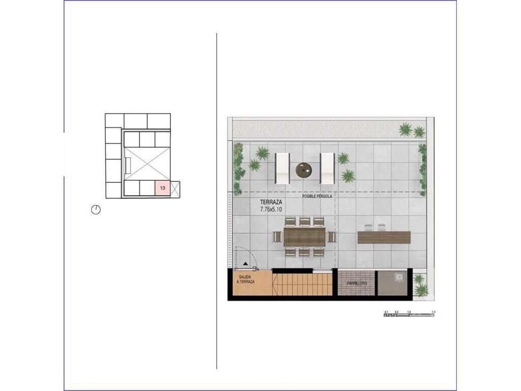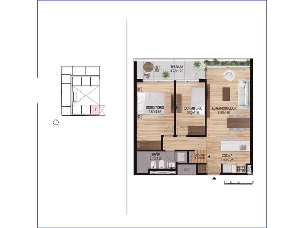 Living comedor con terraza, cocina integrada con placares, 2 dormitorios con placares y 1 baño completo, escalera interior hacia azotea propia de 42 m2 con parrillero y depósito.