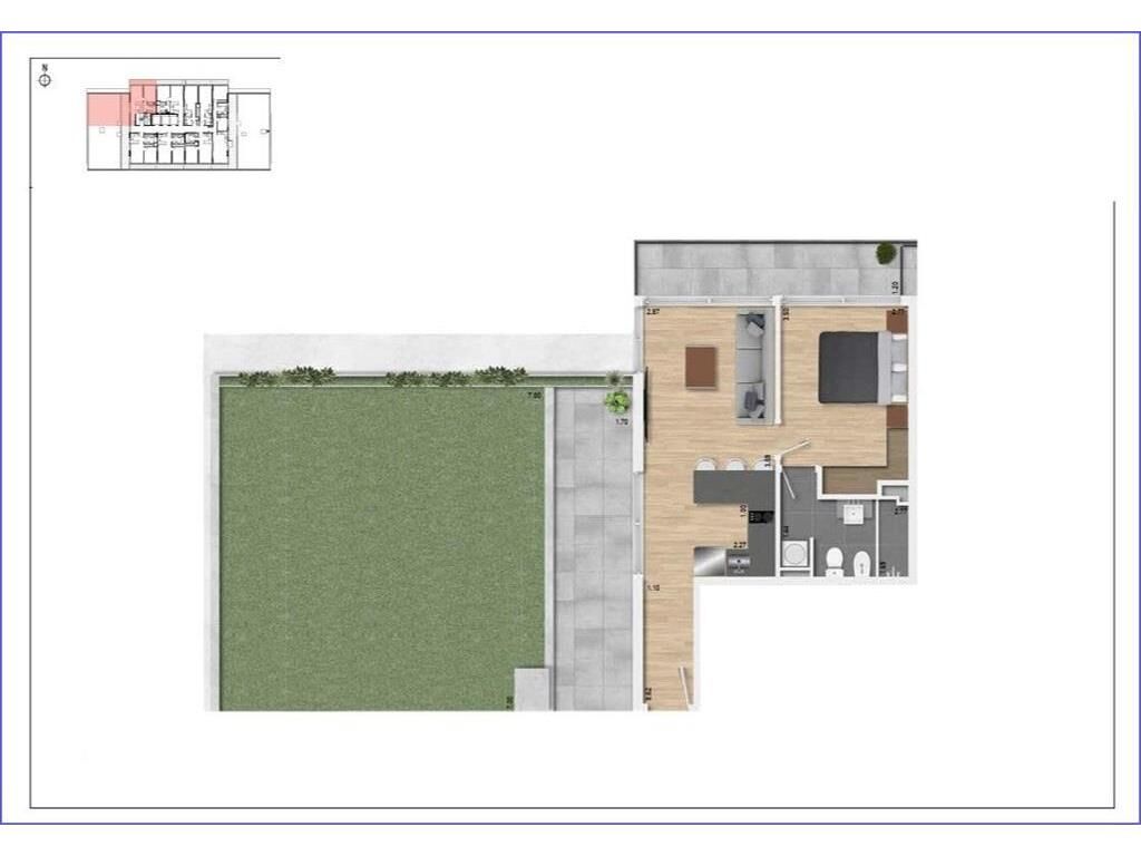 Living comedor con terraza de 85m2 , cocina integrada con placares, 1 dormitorio, 1 baño.