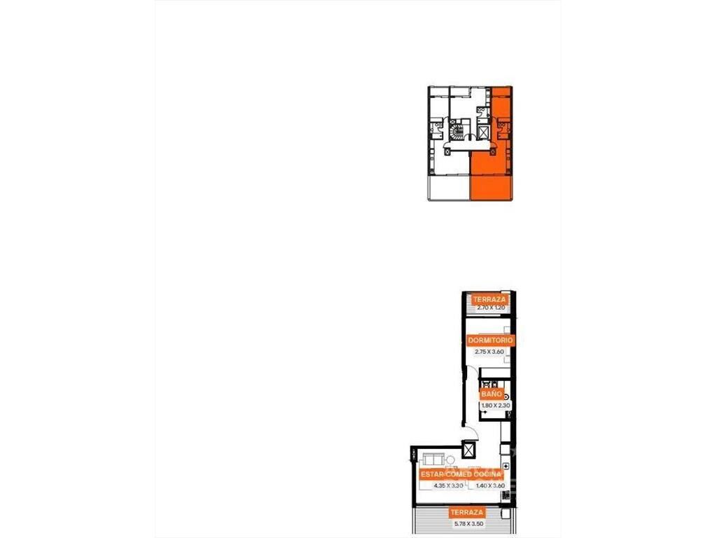 Living comedor con terraza al frente de 26m2, cocina integrada con placares, 1 dormitorio hacia atrás con terraza, 1 baño completo.