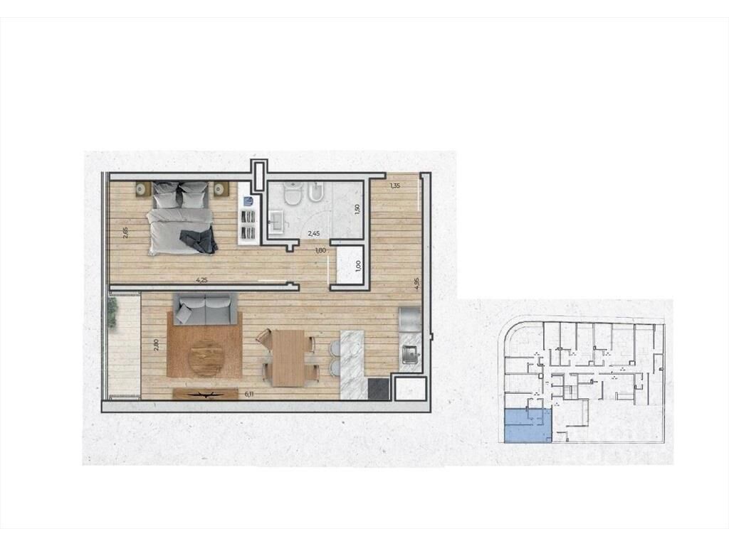 Todos los ambientes dan al frente. Living comedor con terraza al frente, cocina integrada con placares bajo y sobremesada, campanas extractoras de acero inoxidable, horno eléctrico de empotrar y anafe vitrocerámico sobre mesada. 1 dormitorio con placard en suite, 1 baño completo.