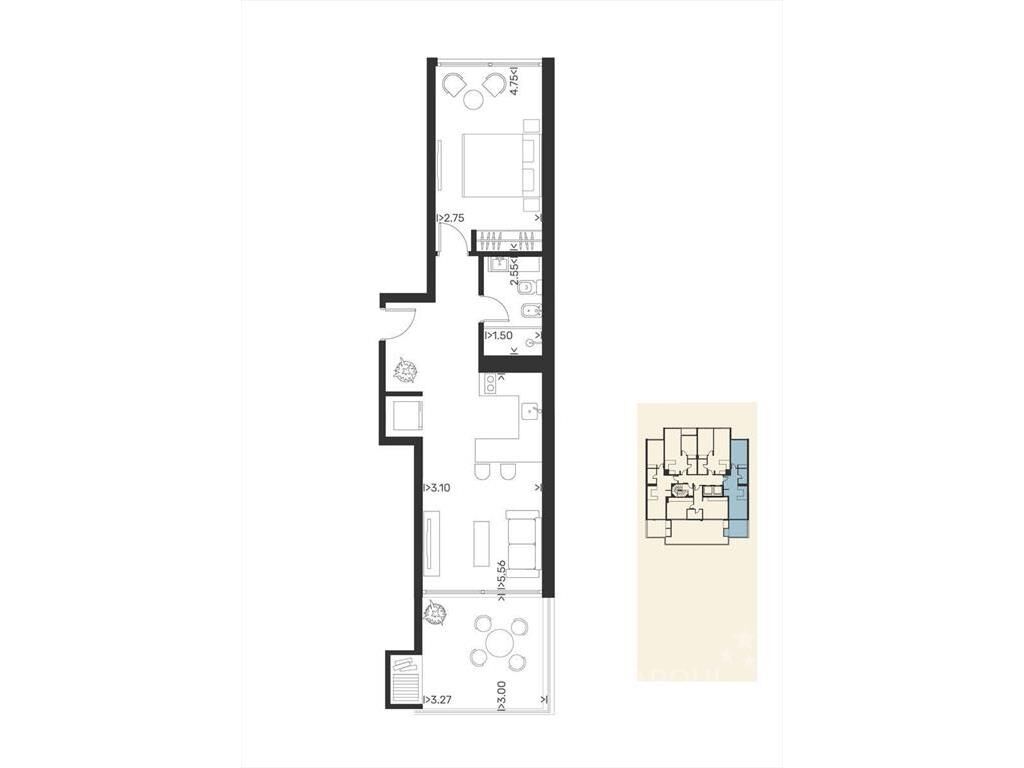 Living comedor con terraza al frente con parrillero, cocina integrada con placares, 1 dormitorio con placard, 1 baño.