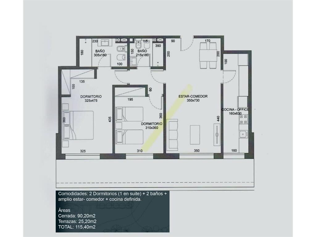 115 m2 en los cuales cuenta con 2 dormitorios (uno en suite), dos baños, gran living - comedor, cocina definida, terraza al frente y lugar de garage ya incluído en el precio.