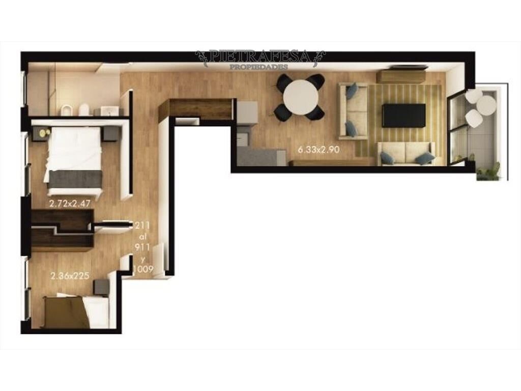 Unidad en piso 9, 56.6m internos 3.4m terraza.