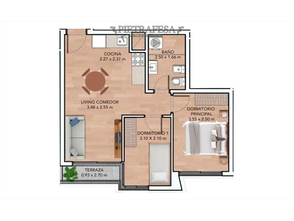 Unidad en planta baja, 44.8m Internos 2.1m Terraza.