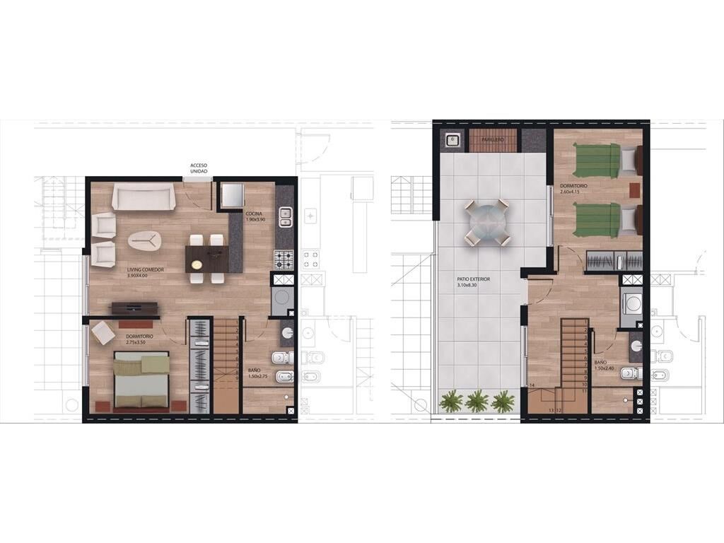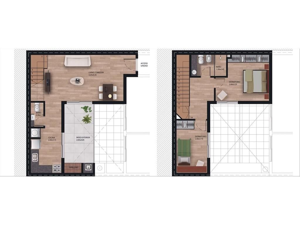Unidades de 2 dormitorios dúplex con terraza con parrillero de uso exclusivo.