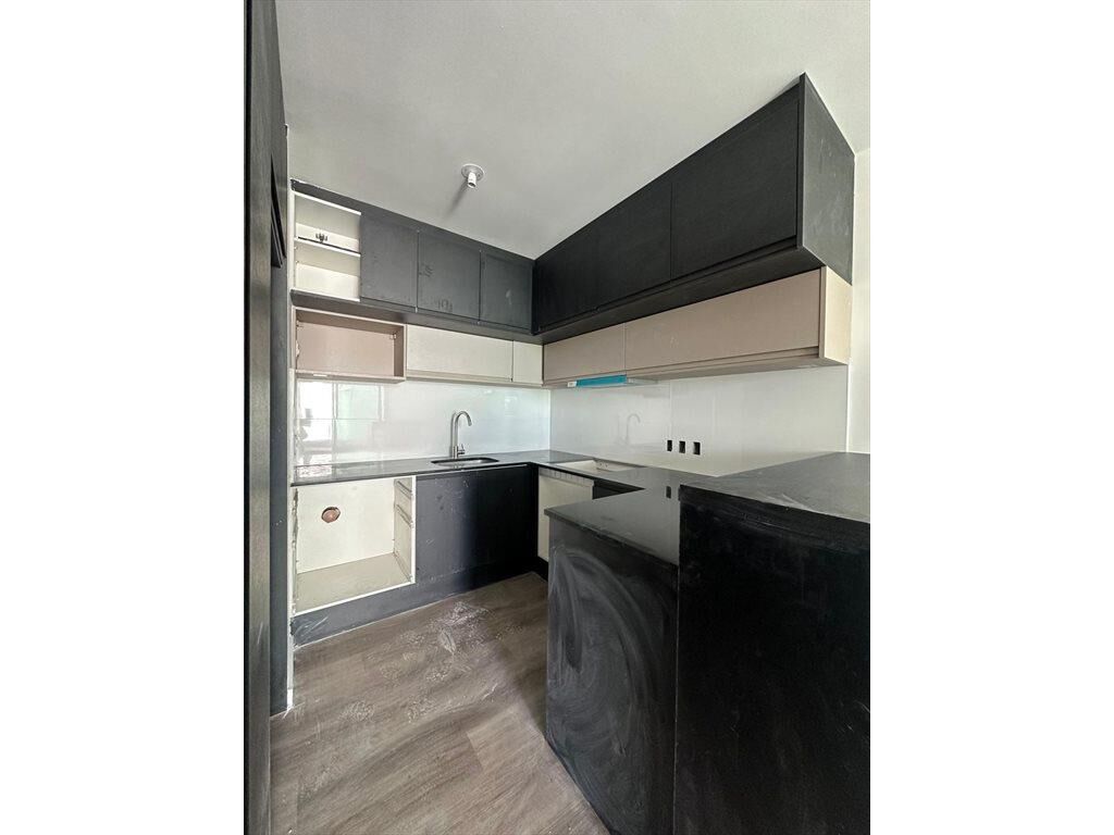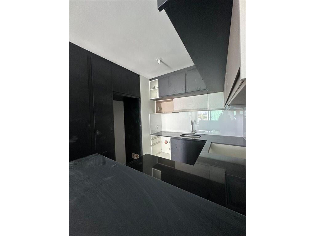Cocina integrada con barra y muebles aereos y bajo mesada, con calefon, anafe y campana ya isntalados.