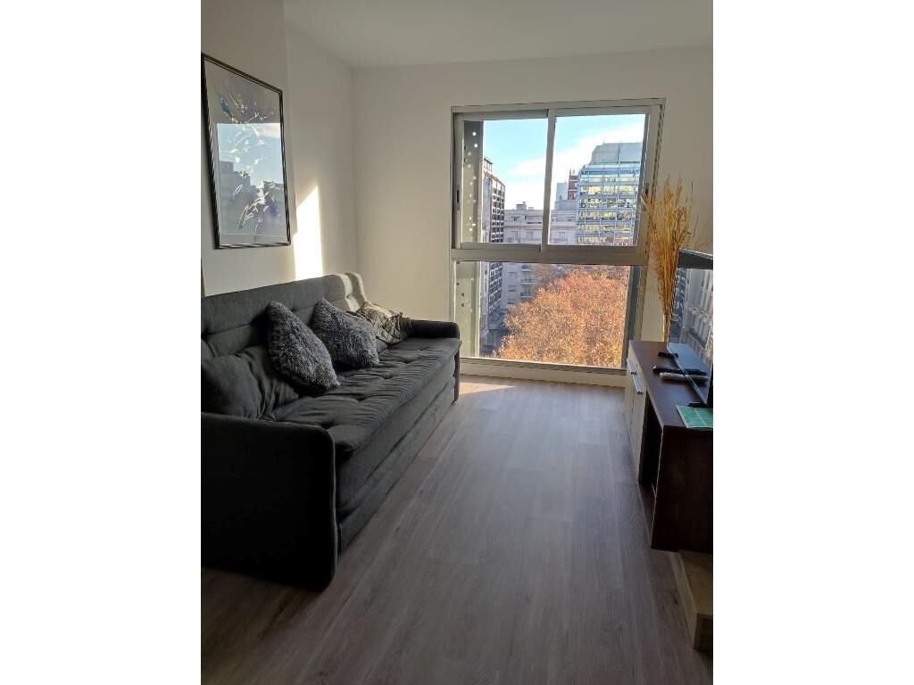 Living comedor muy luminoso con aire acondicionado y hermosa vista en altura a la plaza Libertad. Postigos metálicos móviles y ventanas de vidrio anodizado con doble vidrio hermético (dvh), sistema Gala integrada con excelente aislación acústica y térmica.