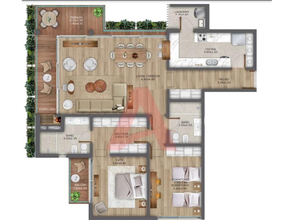 METRAJE: 121 m2 área propia + 21 m2 terrazas + 122 m2 de rooftop con parrillero