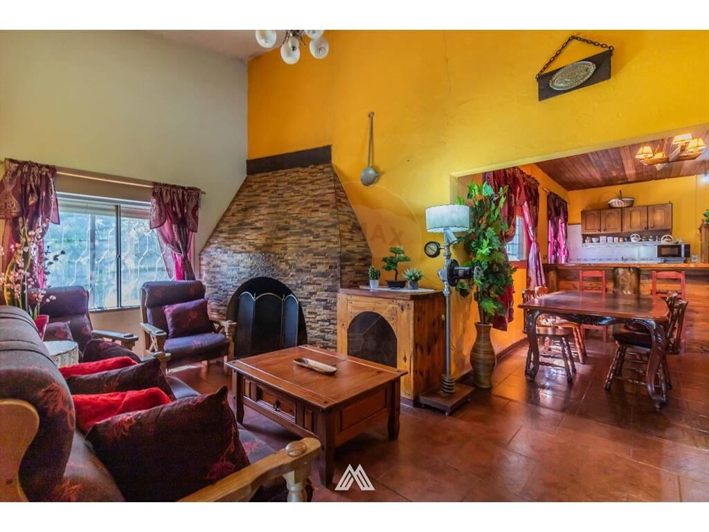 Calido living con estufa a leña y cocina-comedor con desayunador.