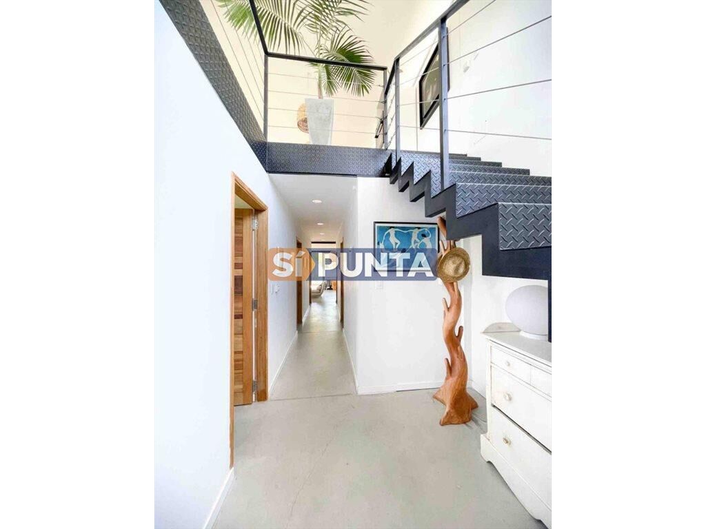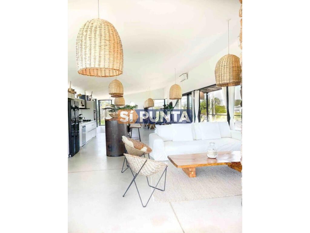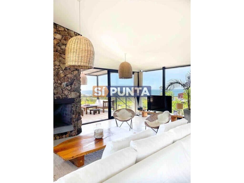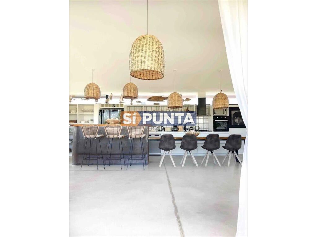 La casa pose 2 estufas u hogares adentro y dos parrilleros uno en la parte alta de la casa y otro abajo cerca de la piscina . Todos los deck tienen mobiliario exterior mesas y sillones blancos , hamacas paraguayas blancas todos con vista al mar .