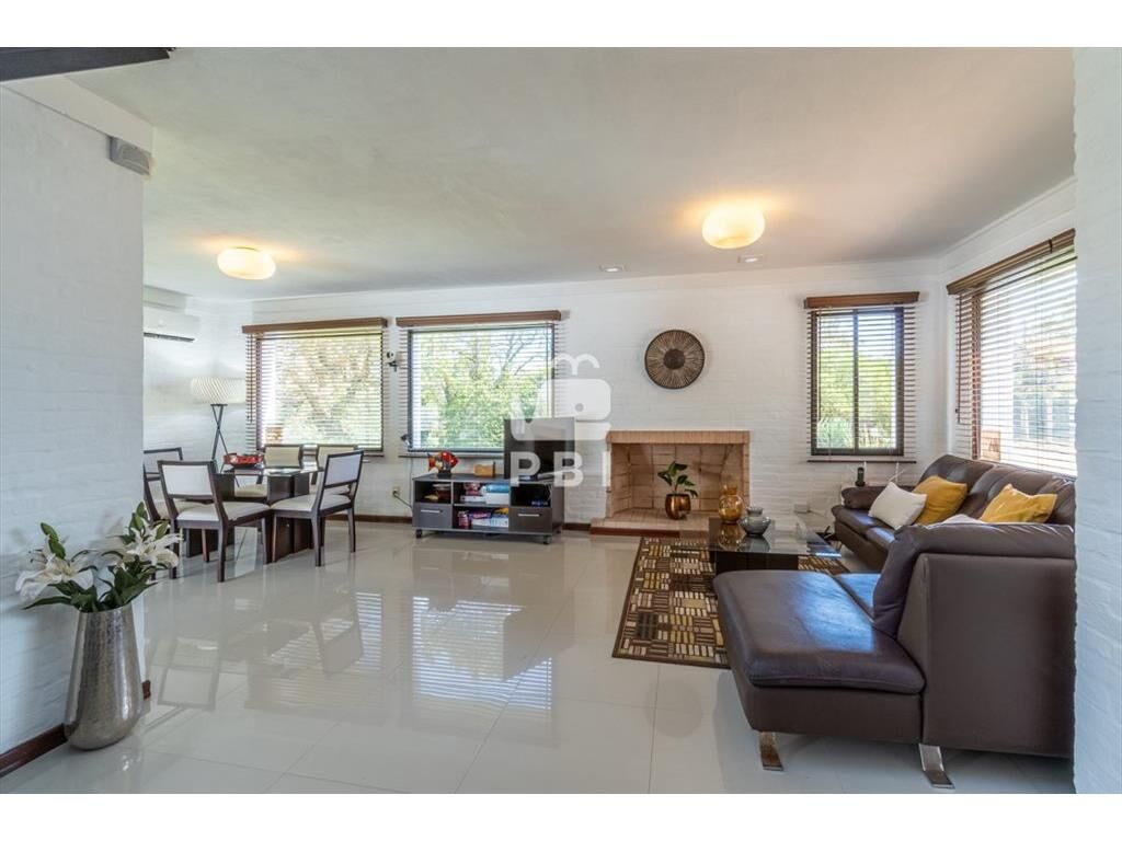 Amplio living comedor con estufa a leña, que conecta con la terraza techada y la piscina climatizada.