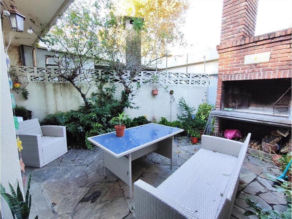 Living comedor al frente con estufa a leña. Vista al jardín del frente y al patio del contrafrente.