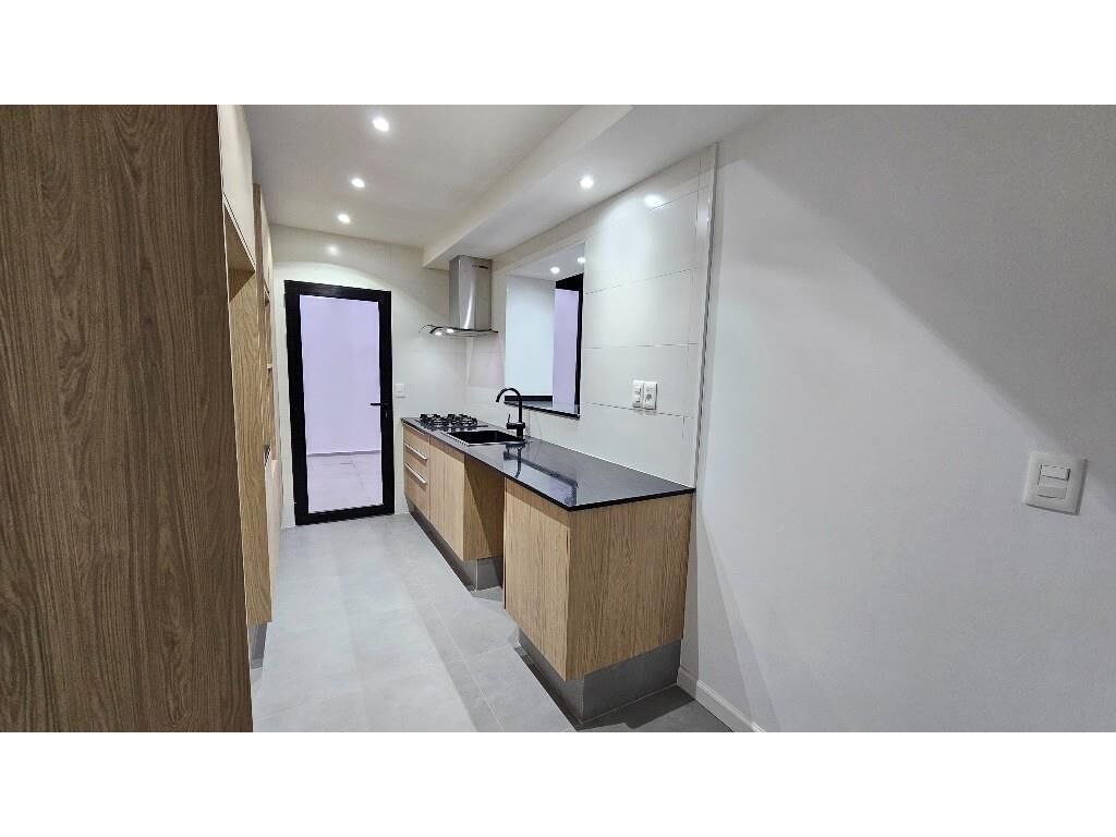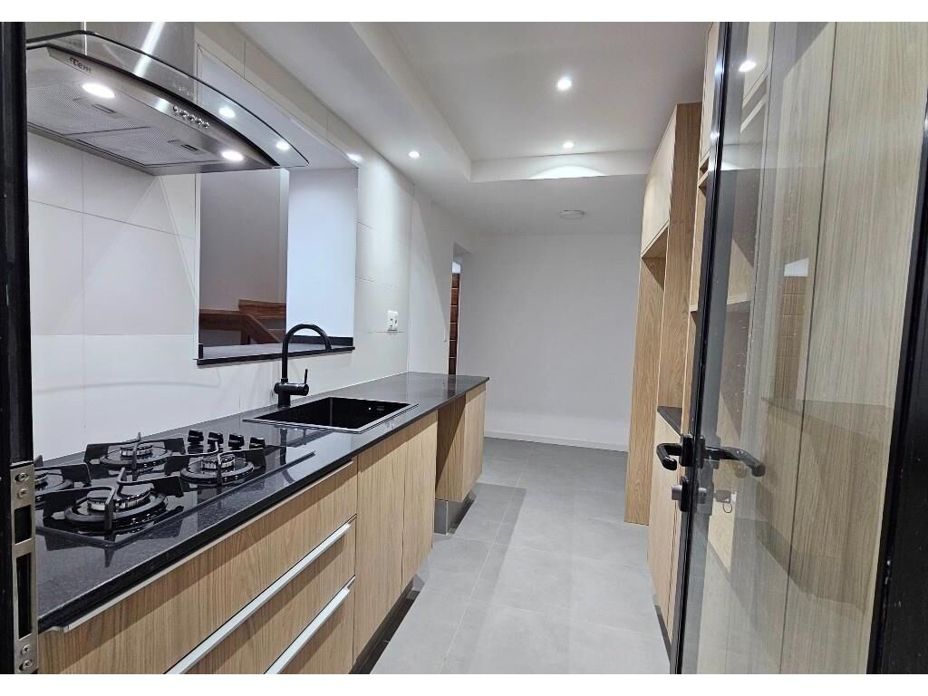 La cocina moderna y definida con comedor diario, está equipada con muebles diseñados para empotrar horno, microondas, heladera y lavavajilla además de entregarse con anafe de cuatro hornallas a gas y campana extractora y con una práctica barra que conecta con el living comedor, ideal para socializar.