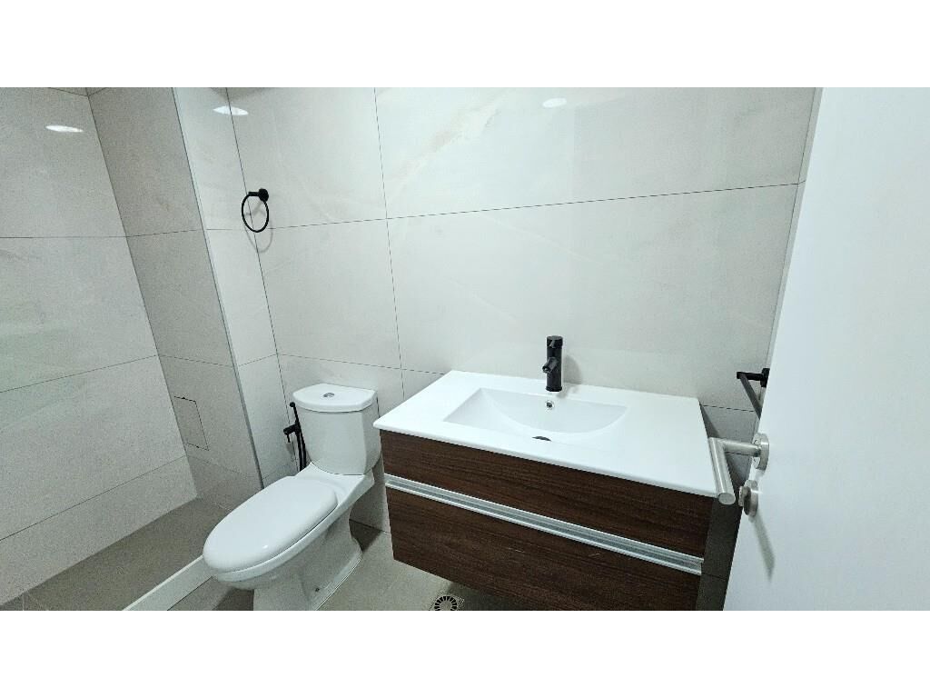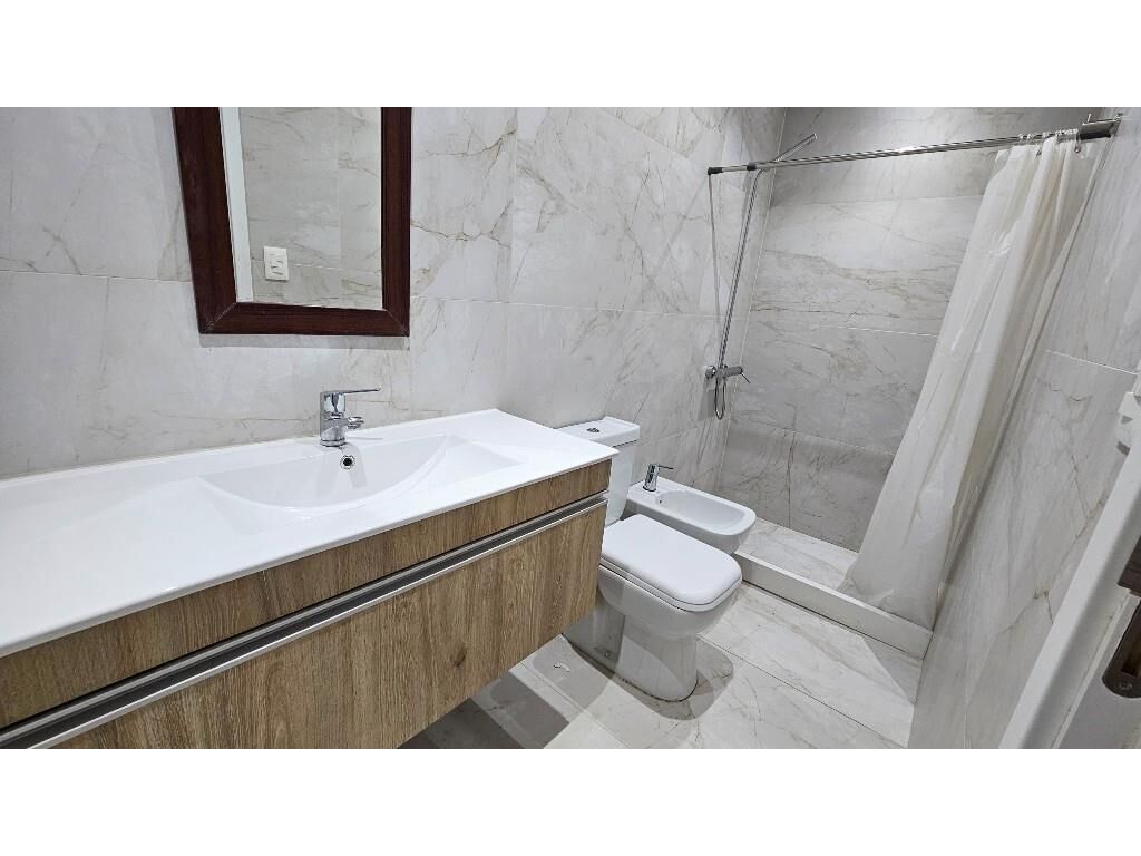 Baño completo con mueble flotante de 80 cm, luces empotradas y extractor.