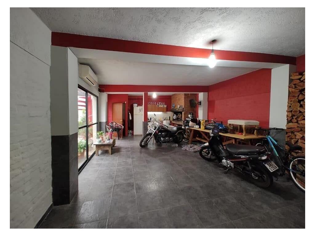 -Amplio garaje - barbacoa con mesada grande en granito amarillo y churrasquera interior, baño, capacidad para dos autos, portón de metal y cedro de 5,40 mts automatizado
