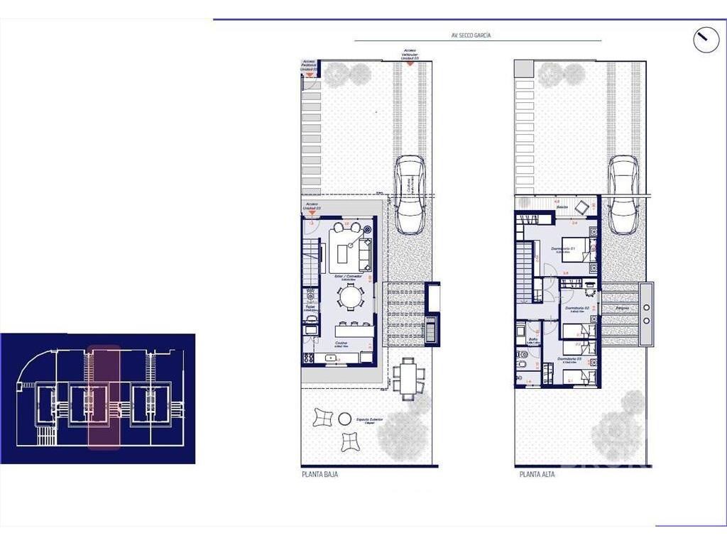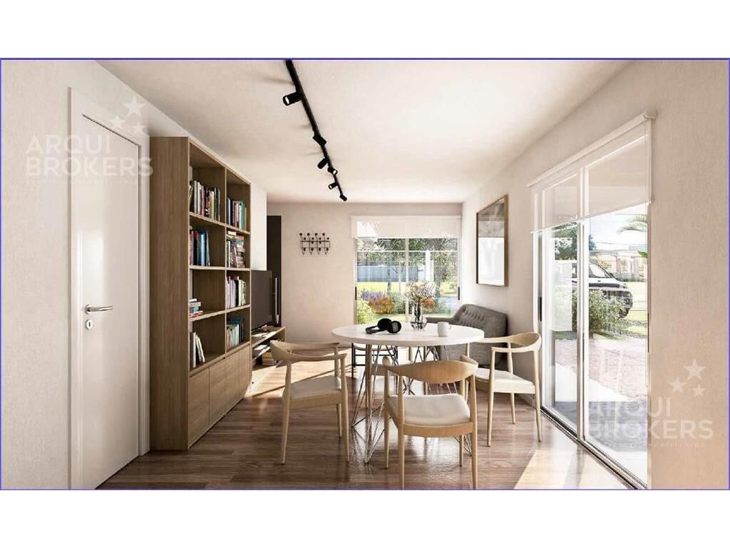 Planta baja: jardín al frente, patio con parrillero y cochera, living comedor con cocina integrada con placares, 1 baño social.