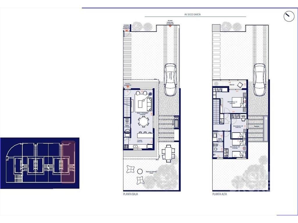 Planta baja: jardín al frente, patio con parrillero y cochera, living comedor con cocina integrada con placares, 1 baño social.