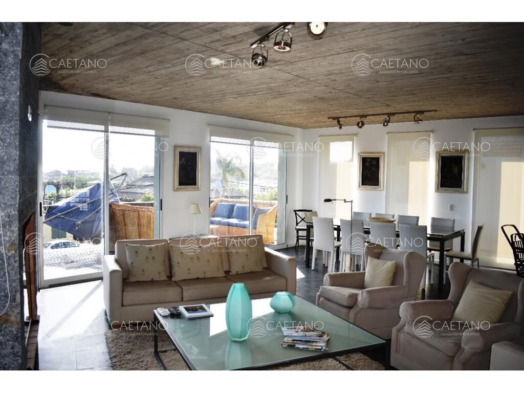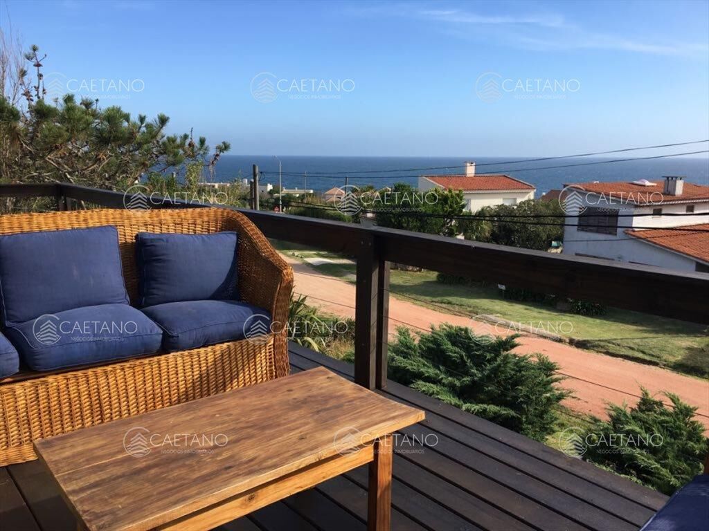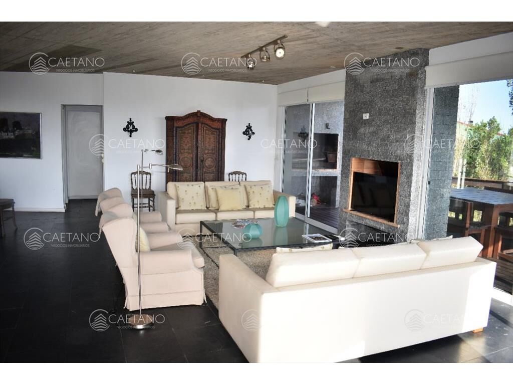Living comedor con amplio balcón terraza tipo deck en madrea con vista al mar y parrillero, cinco dormitorios, cinco baños, cuatro en suite, cocina, palie de descanso, piscina, jardín, alarma , wi-fi, muy bien equipada.