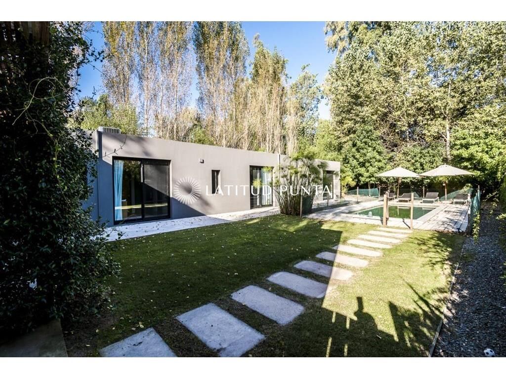 Jardín que rodea toda la casa, con cerramiento de cerco vivo, ofreciendo una vista despejada y verde desde cualquier rincón. Aquí se ubica el parrillero techado con living exterior y excepcional vista a la piscina.