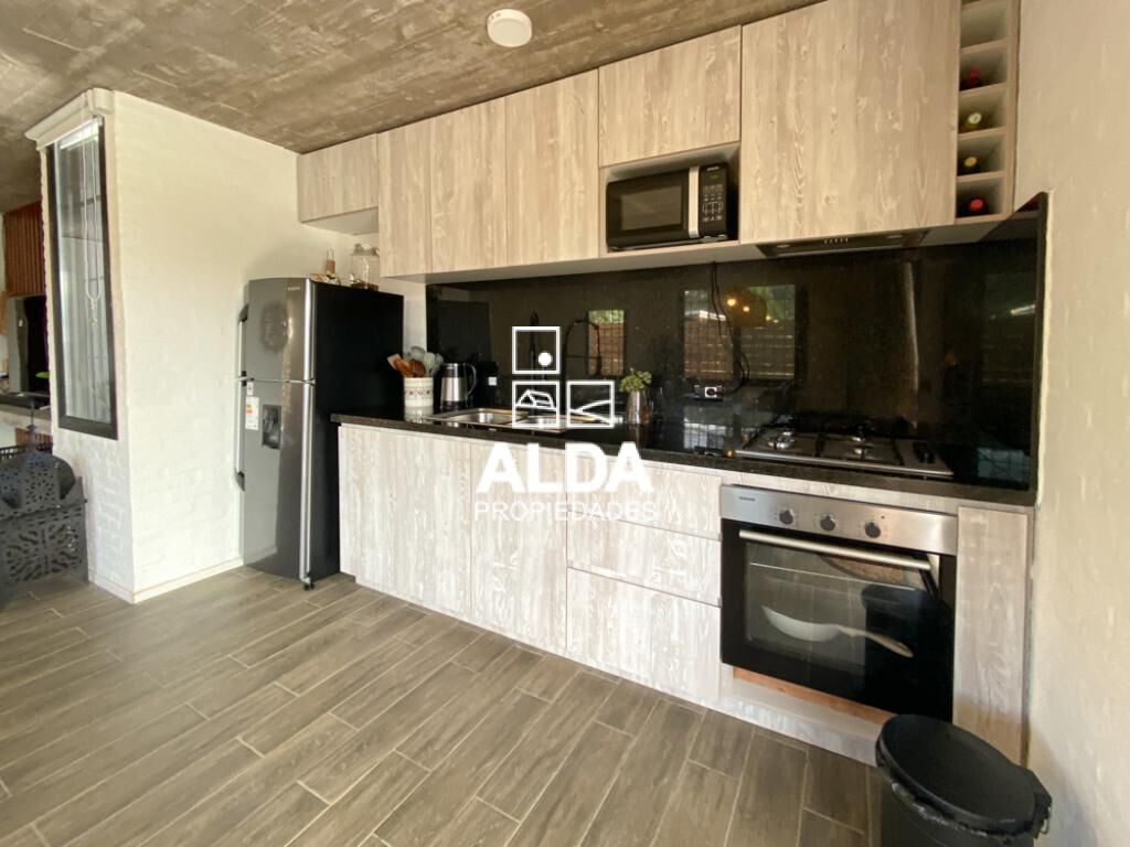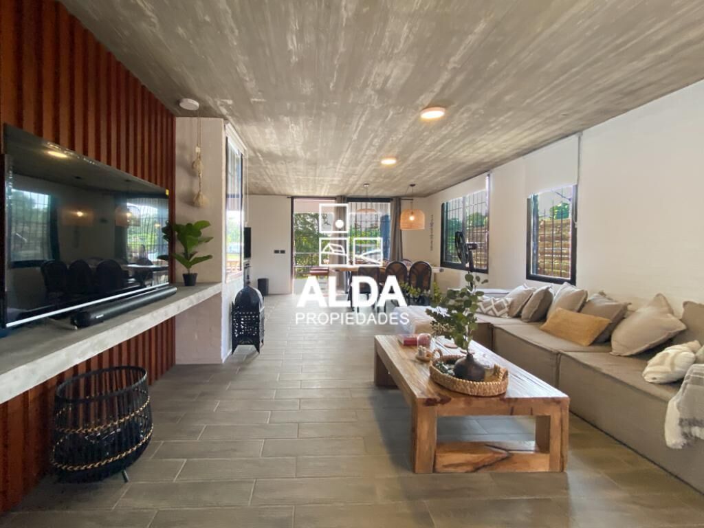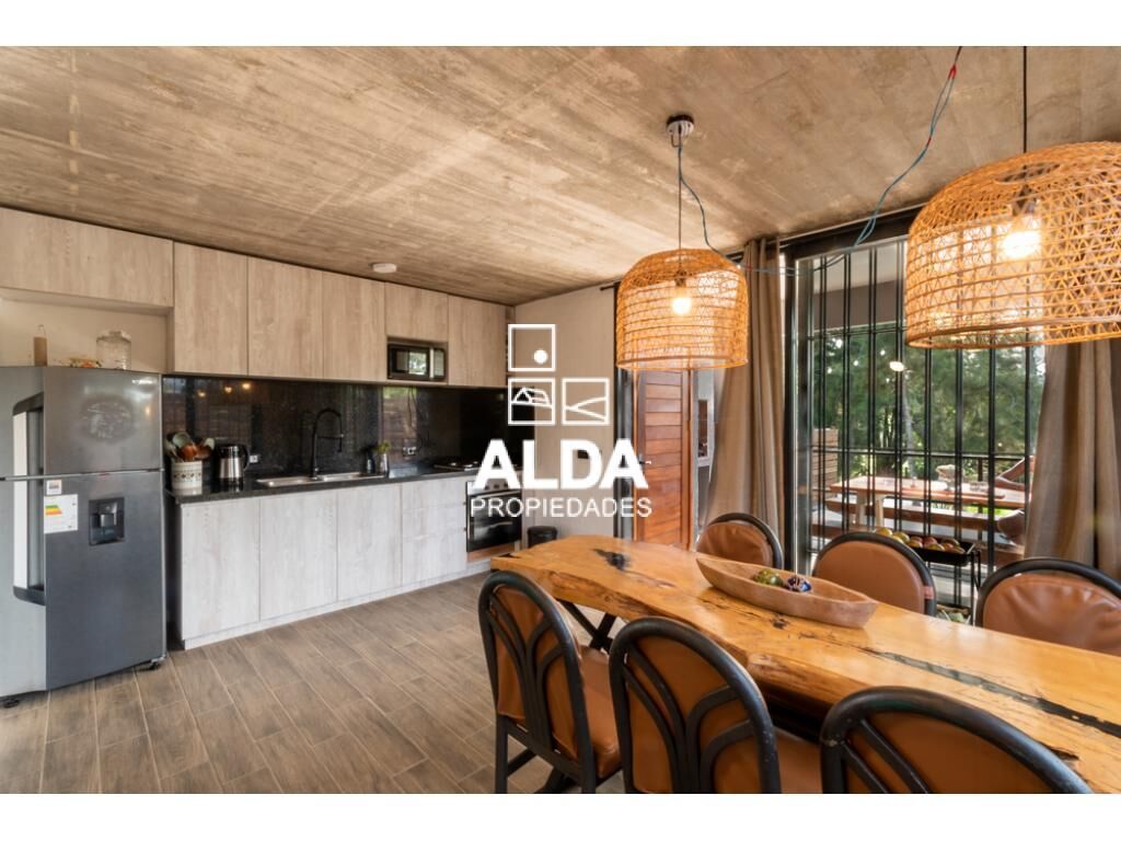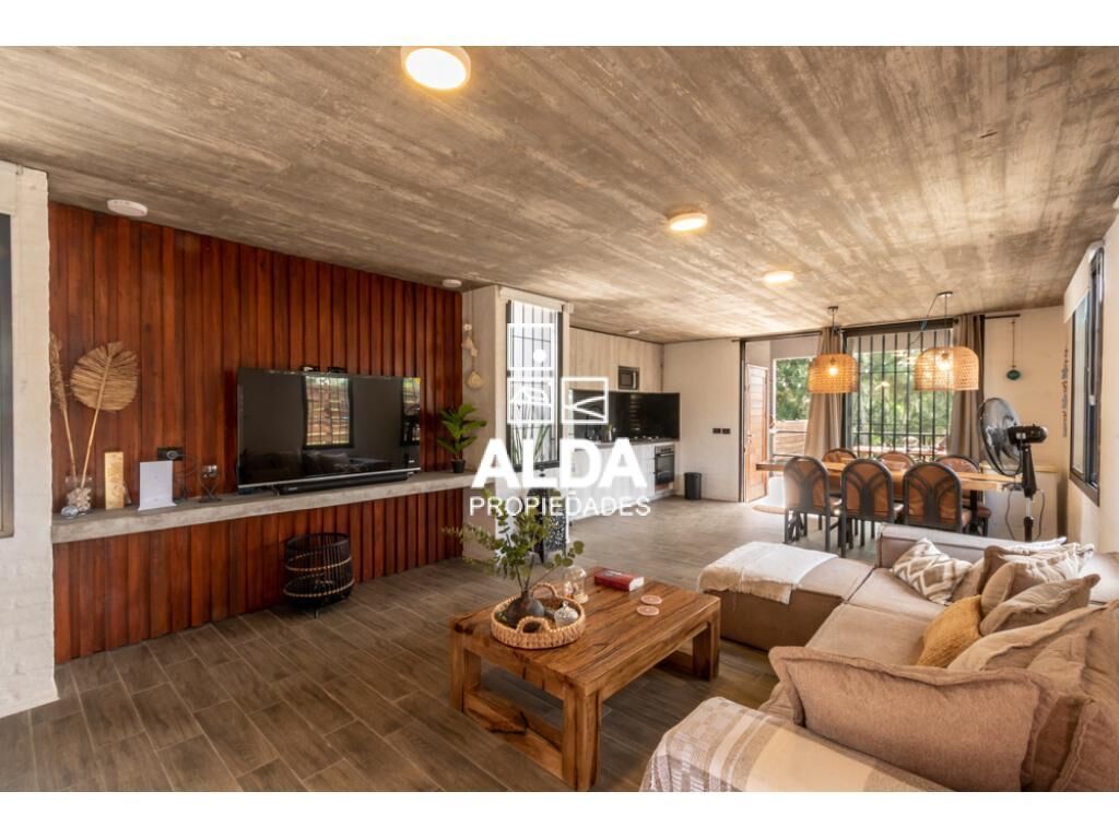 Su interior cuenta con un luminoso living-comedor con estufa a leña, cocina integrada, tres dormitorios y dos baños completos (uno en suite). En el exterior, se destacan la cochera lateral, el parrillero cubierto con toilette y una piscina ideal para el disfrute.