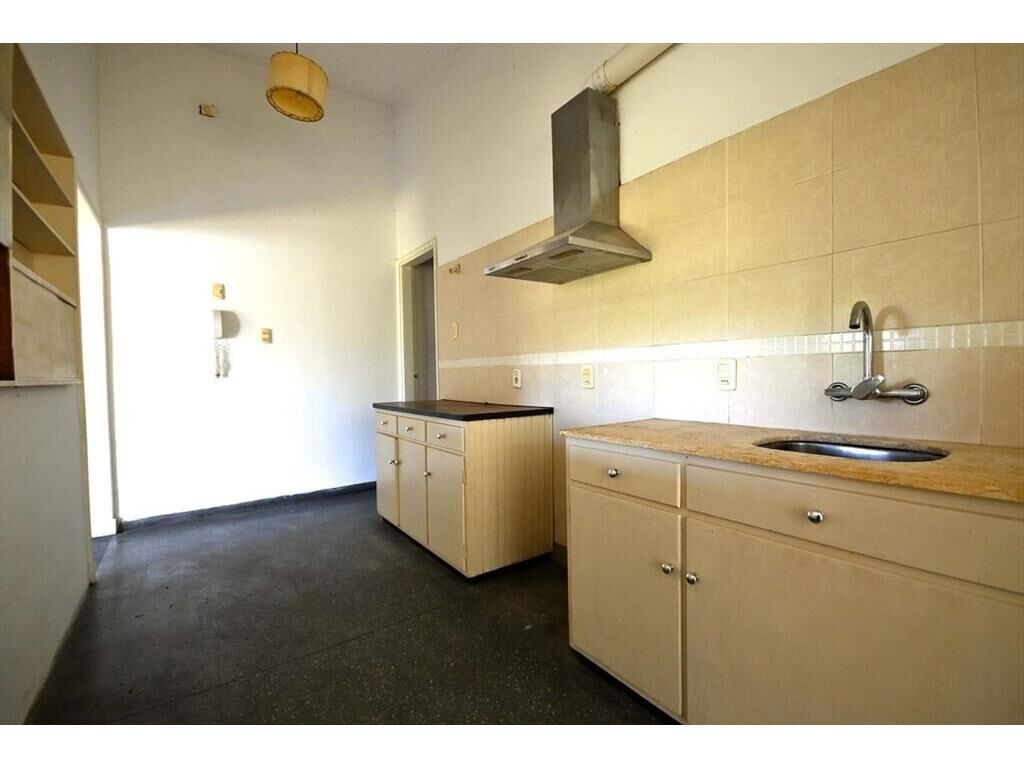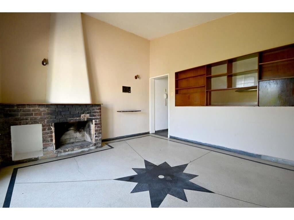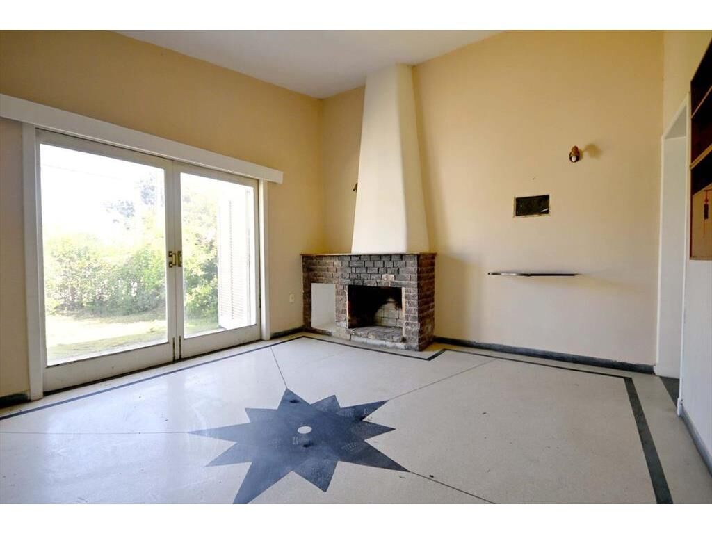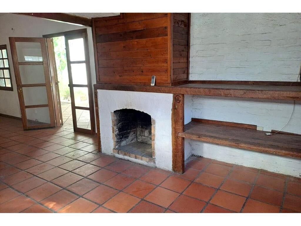 Espacioso y luminoso living con puerta ventana hacia el jardín delantero, estufa a leña, aberturas de madera en buen estado y piso de monolitico en situ.