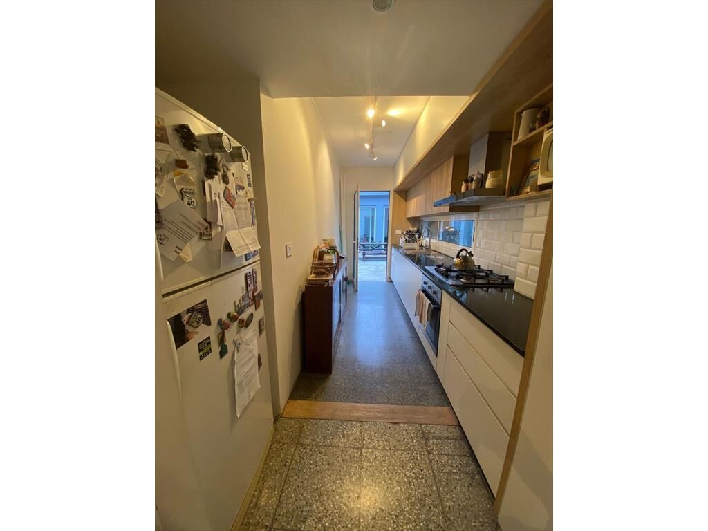Cocina definida con profusión de placares, anafe, horno eléctrico y campana extractora.