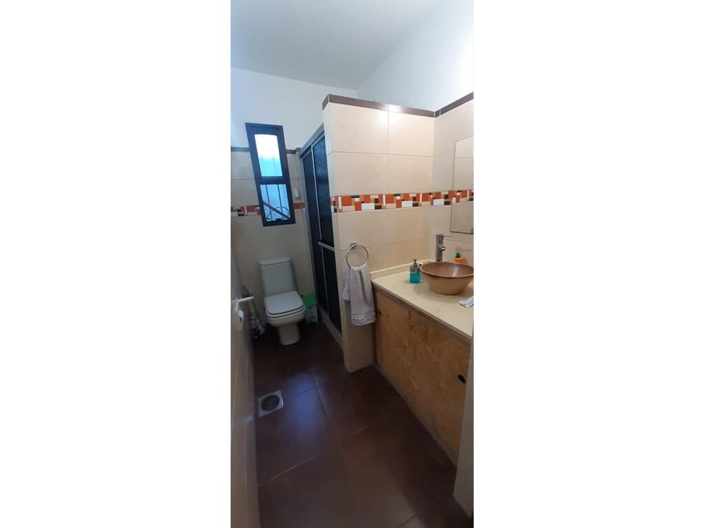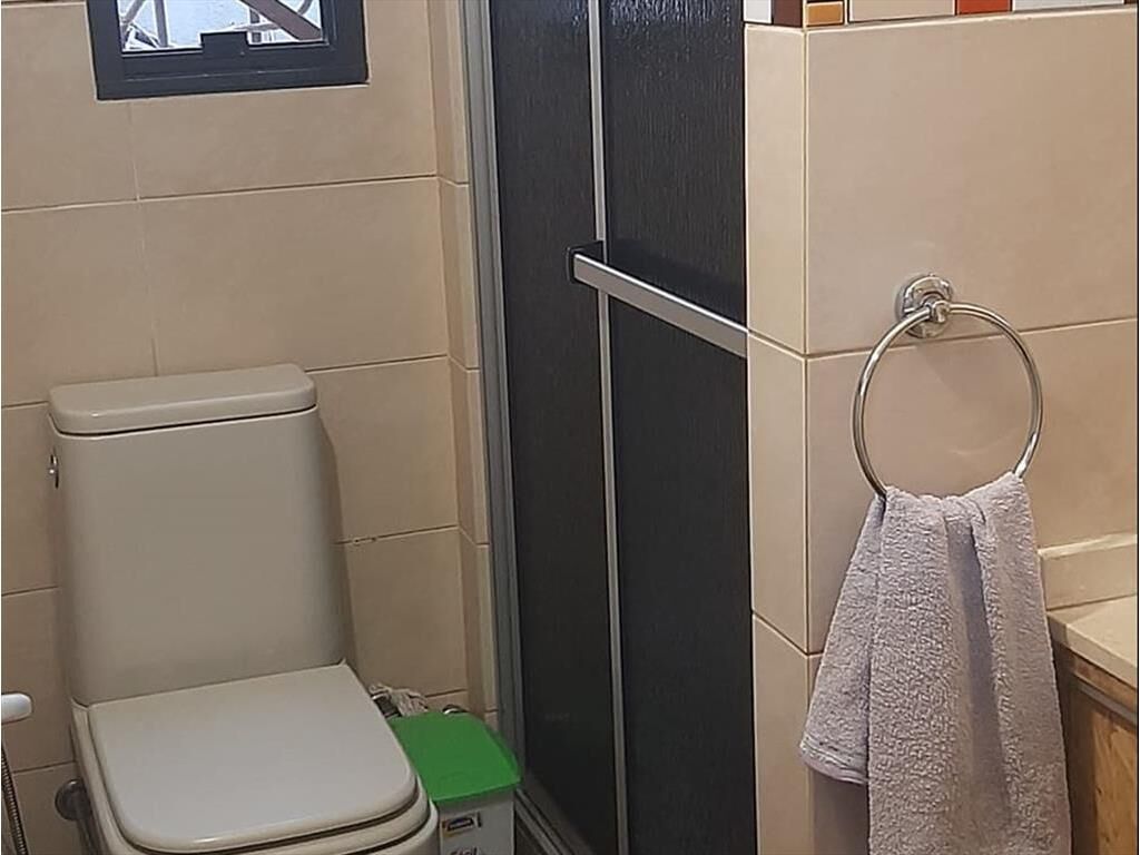 Continuamos y encontramos el baño, amplio y completo, actualizado. Con instalación para el lavarropas y placard aéreo. Mueble dónde apoya la bacha y mampara en la ducha. También con ventana de ventilación y luz al patio.
