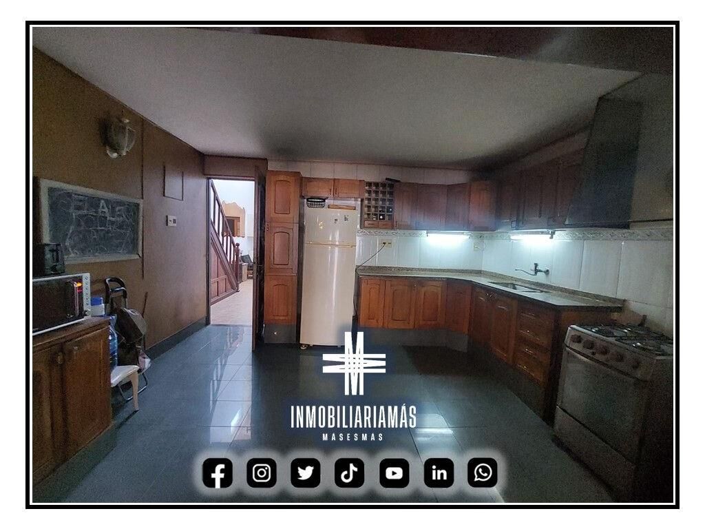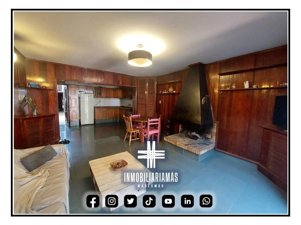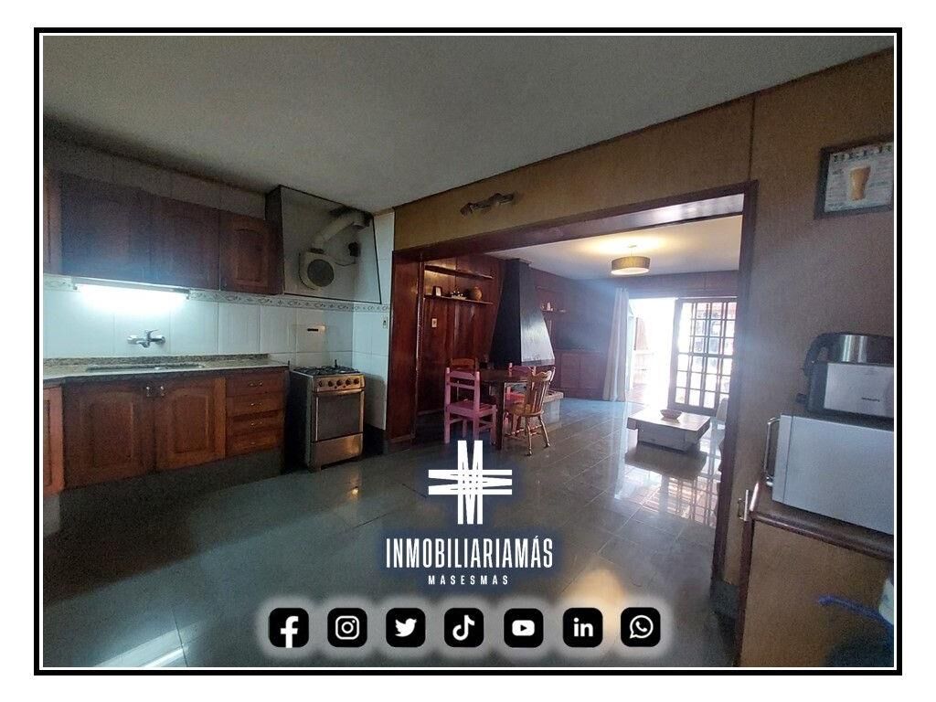 Cocina integrada con muebles bajo y sobre mesada de madera, living comedor muy amplio, con estufa a leña y paso hacia el patio.