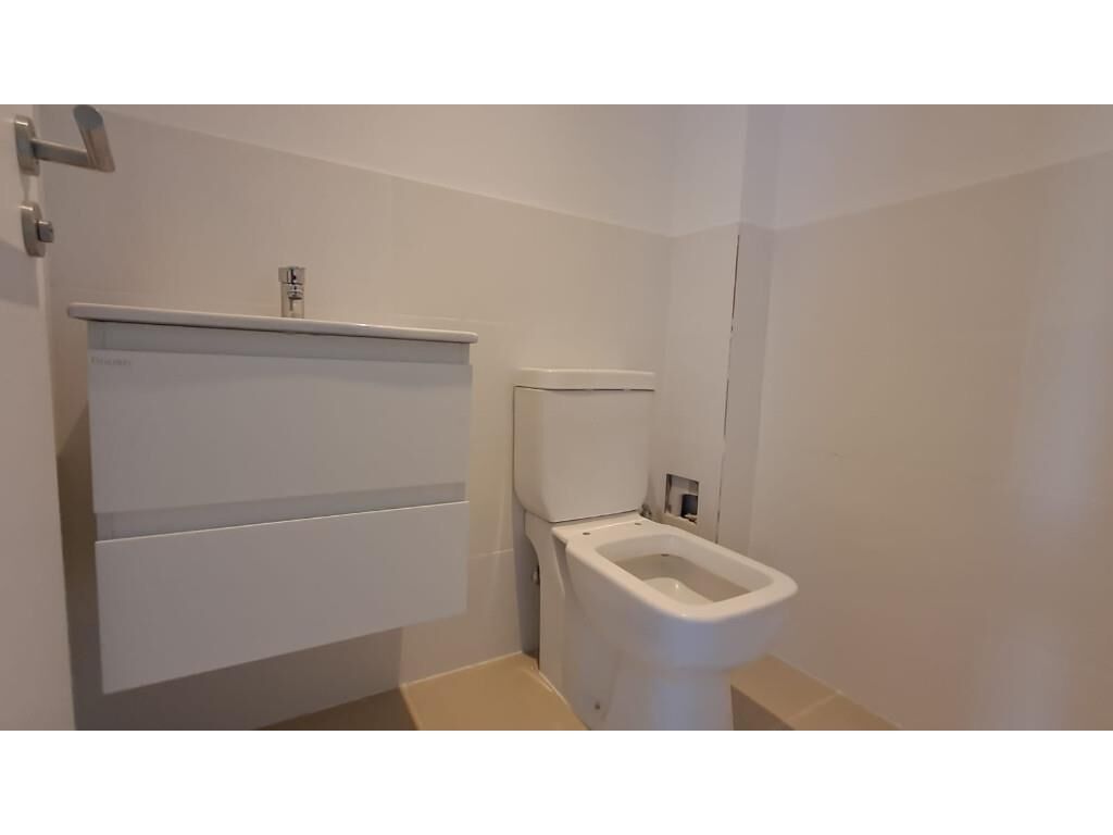 toilette con bacha en cerámica sobre mueble flotante de dos cajones.