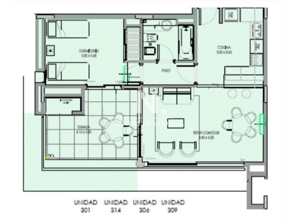La unidad cuenta con 1 dormitorio y 1 baño, un luminoso living-comedor con cocina integrada que se extiende hacia una terraza privada, ideal para relajarse o disfrutar del entorno verde. Además, dispone de estacionamiento propio, brindando mayor comodidad y seguridad.