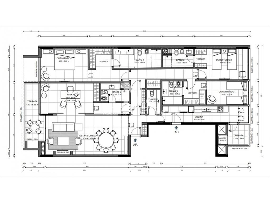 Consta de 3 dormitorios en suite con vestidor, estudio, 1 baño adicional, toilette, living-comedor, cocina con desayunador y balcón con parrillero.