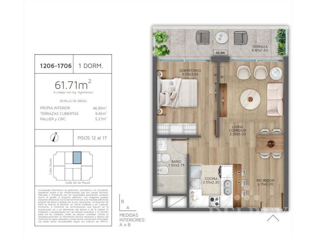 Financiación propia por tiempo limitado.!!! Reserva 5% Compromiso 5% 80 Coutas mensuales Ocupación 10%  Intereses post ocupación 7.88% Conexiones ( a momento de ocupación ) 4% INVERTÍ EN EL PRÓXIMO PUNTO DE REFERENCIA DE POCITOS CON EL MEJOR DISEÑO Y CALIDAD PREMIUM. Un hermoso apartamento único en su metraje y terminaciones. Living comedor con excepcional terraza. Dormitorio muy cómodo con placares, ventanales, vidrios DHV etc. Cocina en forma de U con profusión de placares. Baño muy moderno. En un edificio que combina todas las características de un producto de excelencia: ubicación, diseño, identidad y tecnología constructiva. Torre de 18 pisos con un gran basamento vidriado envuelto por una pasiva de columnas de doble altura. La base traslúcida contiene el gran lobby de acceso y un local comercial en planta baja, además de un primer piso corporativo de layout libre. Un paseo peatonal público de 17m de ancho, cuidadosamente diseñado, conecta ambas calles y separa la torre de su lindero mejorando su privacidad y la de sus vecinos. A 50 metros de altura, una terraza 360o con estupendas vistas, rodea los amenities Calidad Premium: dos barbacoas fusionables y un gimnasio de última generación. AMENITIES: Gimnasio 2 barbacoas Terraza 360 275m2 de layout libre para empresa Lobby de diseño con concierge 24/365d Paseo Peatonal Público enjardinado Plataforma con juegos para niños Laundry de lavado y secado con App Pick-up lockers Conexión para autos eléctricos Bici-parking con racks de soporte Una torre para el mundo de hoy, con mucha vida interior, vibrante durante el día, luminosa por las noches. Calidades Aberturas de aluminio de alta prestación con DVH. Losa radiante eléctrica con control individual por ambiente. Pisos de madera natural plastificados semi-mate. Pisos y revestimientos en porcelanato importado calidad premium. Carpintería de madera de alto nivel. Mesadas de Silestone o Quartz, mármol y granito. Cortinas de enrollar de aluminio en dormitorios. Campana, horno y anafe eléctrico importados. Previsión de eléctrica y desagües para splits frío-calor en estar y dormitorio principal. Conexión Wi Fi en zonas comunes. 3 ascensores de última generación de gran capacidad. Hall de acceso y palliers totalmente equipados. 4% Conexiones. DEL REY PROPIEDADES 26 de Marzo 1318 Tel. 27098383* Celulares 095829405 www.delrey.com.uy .