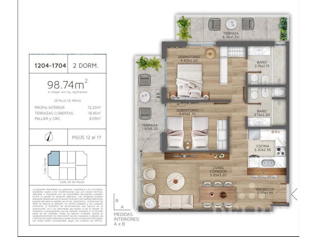 Financiación propia por tiempo limitado.!!! Reserva 5% Compromiso 5% 80 Coutas mensuales Ocupación 10%   Intereses post ocupación 7.88% Conexiones ( a momento de ocupación ) 4% INVERTÍ EN EL PRÓXIMO PUNTO DE REFERENCIA DE POCITOS CON EL MEJOR DISEÑO Y CALIDAD PREMIUM. Un hermoso apartamento único en su metraje y terminaciones Living comedor con excepcional terraza. 2 Dormitorios muy cómodos con placares, ventanales, vidrios DHV etc. Terraza íntima. 2 baños. El dormitorio principal es en suite. Cocina en forma de U con profusión de placares de primera calidad. En un edificio que combina todas las características de un producto de excelencia: ubicación, diseño, identidad y tecnología constructiva. Torre de 18 pisos con un gran basamento vidriado envuelto por una pasiva de columnas de doble altura. La base traslúcida contiene el gran lobby de acceso y un local comercial en planta baja, además de un primer piso corporativo de layout libre. Un paseo peatonal público de 17m de ancho, cuidadosamente diseñado, conecta ambas calles y separa la torre de su lindero mejorando su privacidad y la de sus vecinos. A 50 metros de altura, una terraza 360o con estupendas vistas, rodea los amenities Calidad Premium: dos barbacoas fusionables y un gimnasio de última generación. AMENITIES: Gimnasio 2 barbacoas Terraza 360 275m2 de layout libre para empresa Lobby de diseño con concierge 24/365d Paseo Peatonal Público enjardinado Plataforma con juegos para niños Laundry de lavado y secado con App Pick-up lockers Conexión para autos eléctricos Bici-parking con racks de soporte Una torre para el mundo de hoy, con mucha vida interior, vibrante durante el día, luminosa por las noches. Calidades Aberturas de aluminio de alta prestación con DVH. Losa radiante eléctrica con control individual por ambiente. Pisos de madera natural plastificados semi-mate. Pisos y revestimientos en porcelanato importado calidad premium. Carpintería de madera de alto nivel. Mesadas de Silestone o Quartz, mármol y granito. Cortinas de enrollar de aluminio en dormitorios. Campana, horno y anafe eléctrico importados. Previsión de eléctrica y desagües para splits frío-calor en estar y dormitorio principal. Conexión Wi Fi en zonas comunes. 3 ascensores de última generación de gran capacidad. Hall de acceso y palliers totalmente equipados. 4% Conexiones. DEL REY PROPIEDADES 26 de Marzo 1318 Tel. 27098383* Celulares 095829405 www.delrey.com.uy .