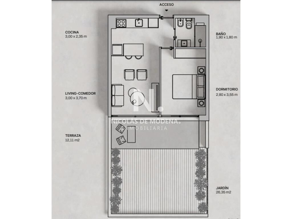 El apartamento cuenta con 1 dormitorio y 1 baño, proporcionando un espacio íntimo y bien distribuido. La cocina está equipada con lo necesario y su diseño eficiente se integra perfectamente con el área de living-comedor, que ofrece un espacio luminoso y versátil, ideal para relajarte o recibir visitas.